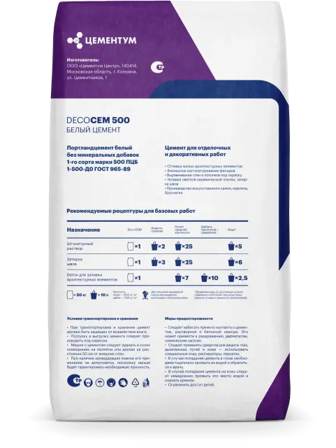 DecoCEM 500 – белый портландцемент без минеральных добавок 1-го сорта белизны, выпускается на основе белого клинкера, подходит для широкого спектра строительных работ. Белый цемент Цементум – это удобный в использовании материал, который высоко ценится современными архитекторами и строителями. Благодаря высокой белизне и возможности окрашивания бетона цветными пигментами, белый цемент предоставляет безграничные возможности для яркой и долговечной отделки улиц, фасадов и помещений.