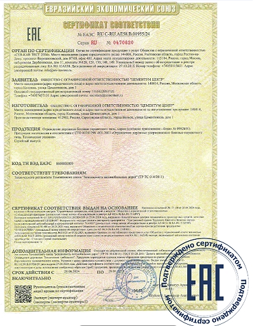 Да, дорожные ограждения ЦЕМЕНТУМ соответствуют требованиям технического регламента Таможенного союза «Безопасность автомобильных дорог» (ТР ТС 014/2011). Сертификат соответствия № ЕАЭС RU C-RU.AE58.B.01955/24 получен на основании натурных испытаний, проведенных на полигоне НАМИ.
